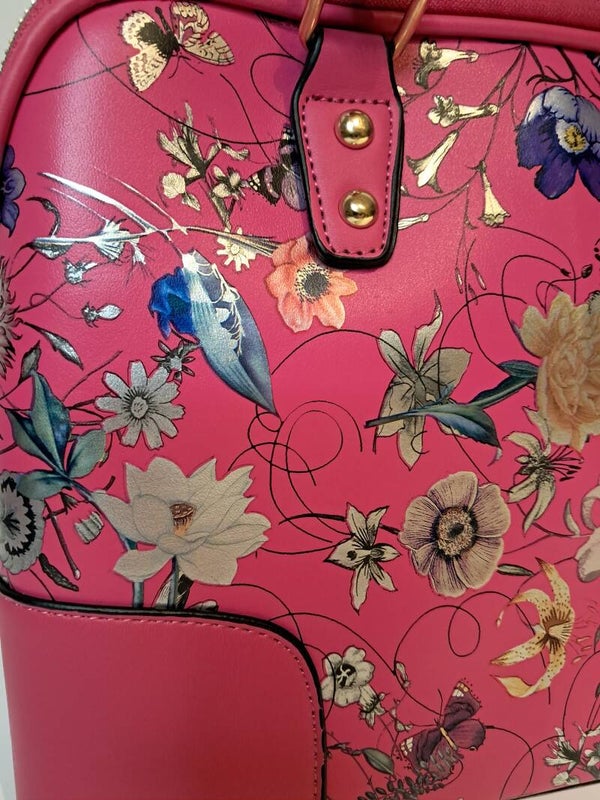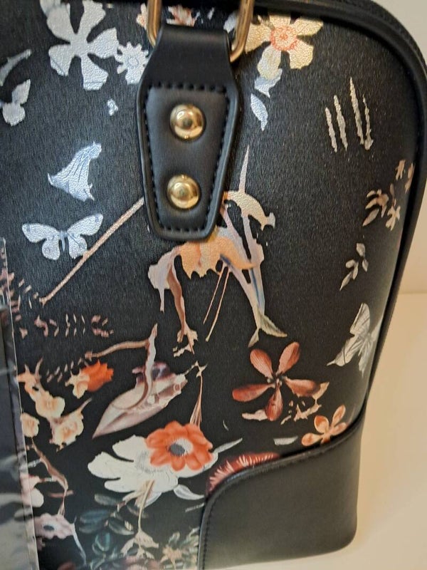 Deze elegante handtas is een echte blikvanger dankzij het prachtige bloemendessin op een diepzwarte achtergrond. De tas heeft een luxe uitstraling met goudkleurige details en stevige handgrepen.